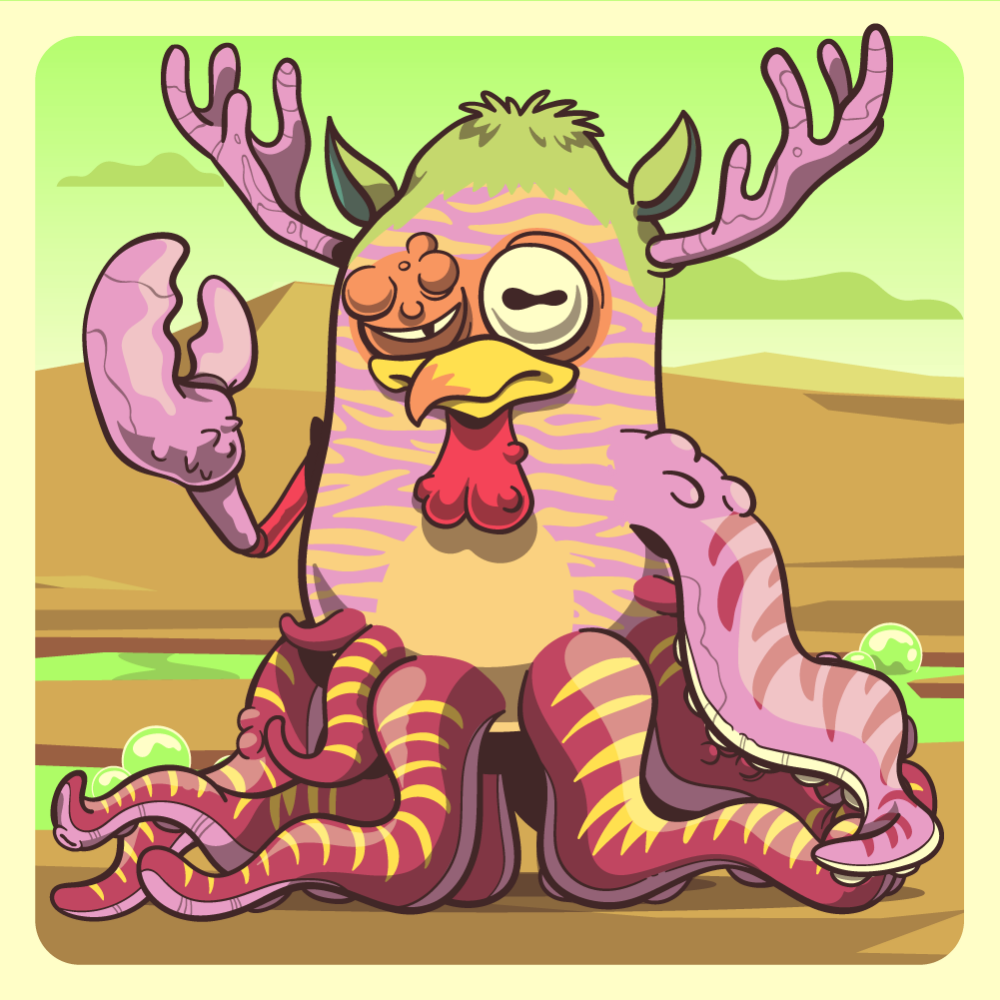 This mutant might have been a Tiger. It features orange lazy eye, uranium chicken beak, green moose antlers, pink octopus tentacle, pink lobster claw for arms and red octopus tentacles for legs. Mutants with Octopi legs are very long-lived, for that, they are considered bring good fortune.