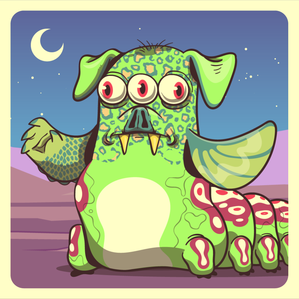 This mutant might have been a Leopard. It features three inline eyes red, green bat snout, fluo dog ears, green fish fin, green crocodile arm for arms and fluo caterpillar abdomen. Mutants with caterpillar abdomen are very resilient. They can knit silk with their tail!