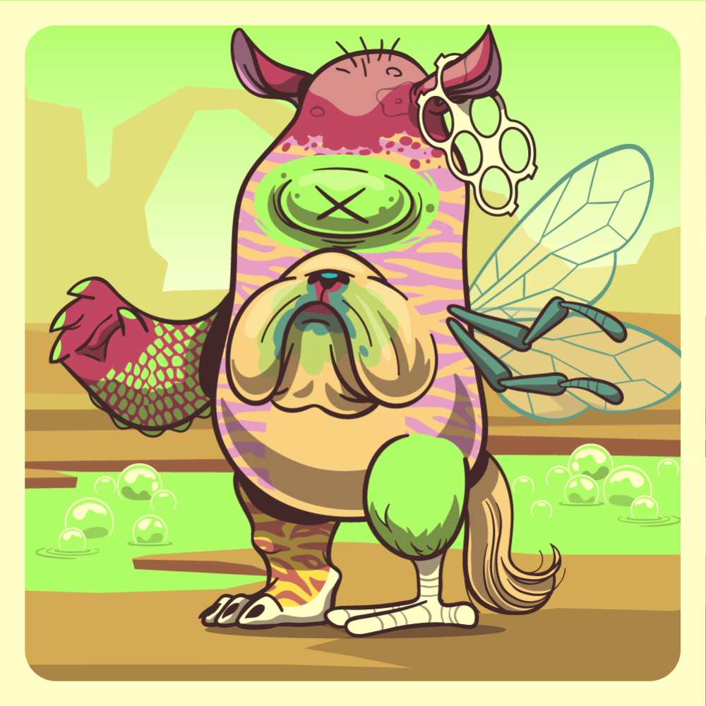This mutant might have been a Tiger. It features fluo mole eye, green bulldog snout, yokes trapped red rhino ears, green bee wing, fluo crocodile arm, fluo chicken leg, uranium mad goat leg and a orange horse tail.