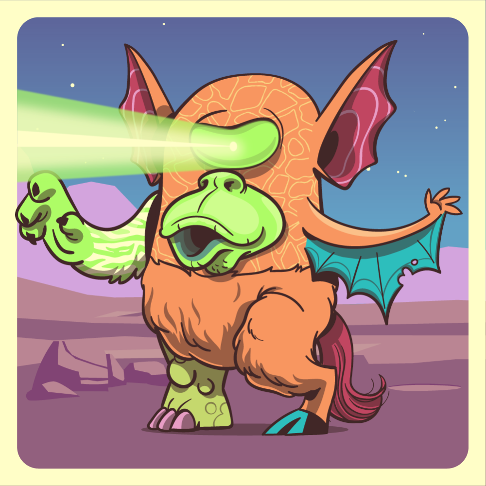 This mutant might have been a Elephant. It features green laser cyclops eye, fluo ape snout, red bat ears, blue bat wing, fluo tiger arm, orange mad goat leg, green rhino leg and a red horse tail.