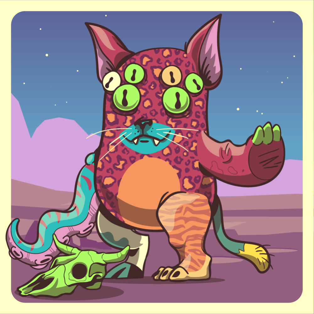 This mutant might have been a Leopard. It features fluo spider eyes, blue yellowcake cow skull bearer cat snout, pink fox ears, red rhino arm, blue octopus tentacle, orange tiger leg, green cow leg and a uranium ape tail.