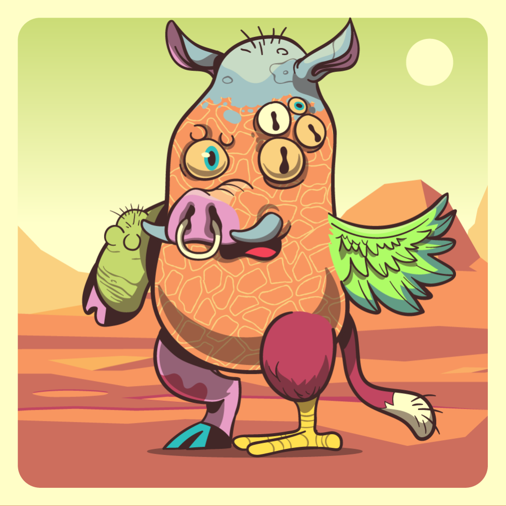 This mutant might have been a Elephant. It features orange one+four eyes, pink boar snout, blue rhino ears, fluo chicken wing, green pig arm, red chicken leg, pink cow leg and a red ape tail.