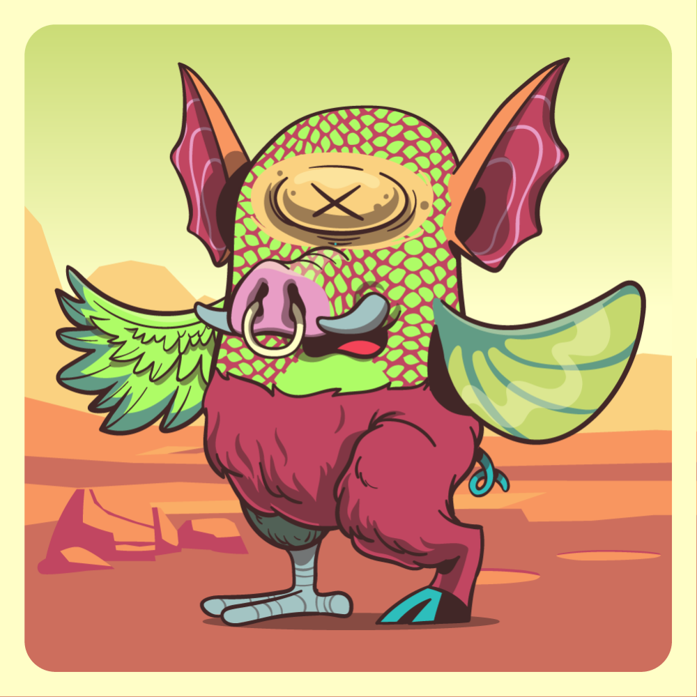 This mutant might have been a Crocodile. It features uranium mole eye, pink boar snout, red bat ears, green fish fin, fluo chicken wing, red mad goat leg, green chicken leg and a blue pig tail.
