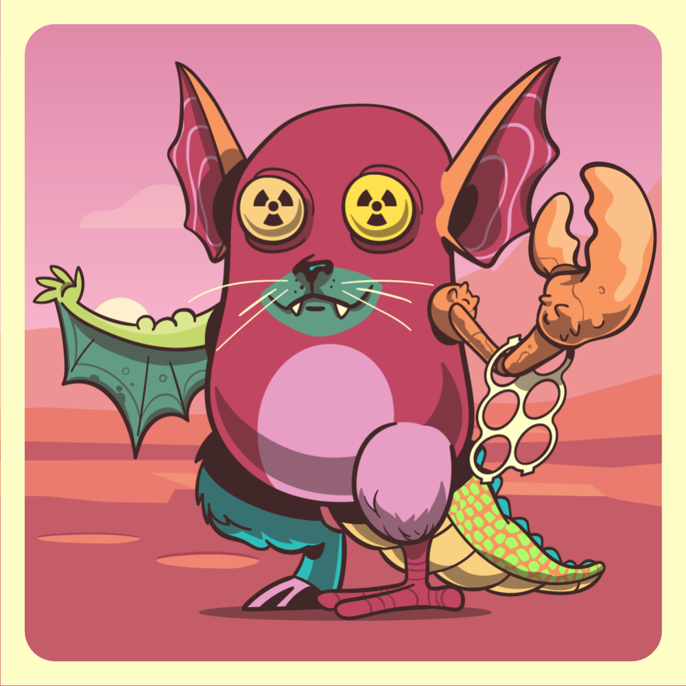 This mutant might have been a Dolphin. It features technicolor redioactive eyes, green cat snout, red bat ears, yokes trapped orange lobster claw, green bat wing, pink chicken leg, blue mad goat leg and a uranium crocodile tail.