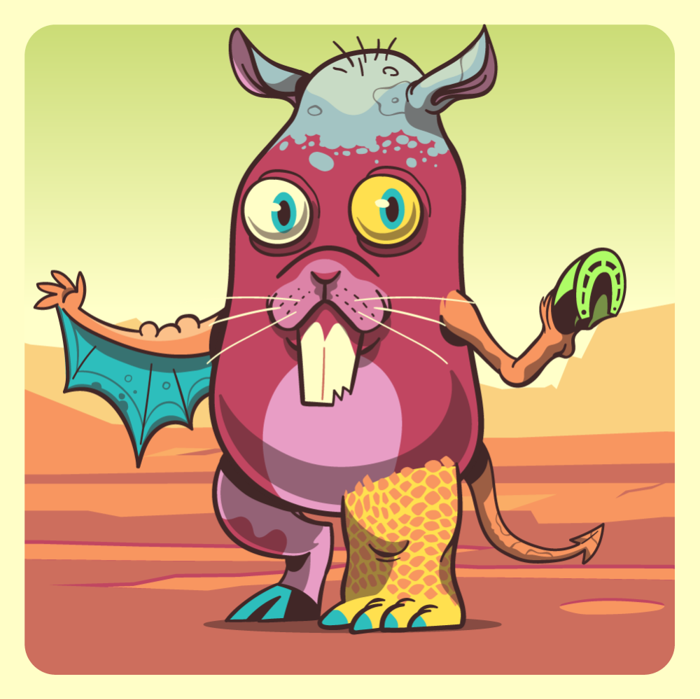 This mutant might have been a Dolphin. It features blue heterochromia left eye, pink rabbit snout, blue rhino ears, orange horse front leg, blue bat wing, orange crocodile leg, pink cow leg and a orange bat tail.