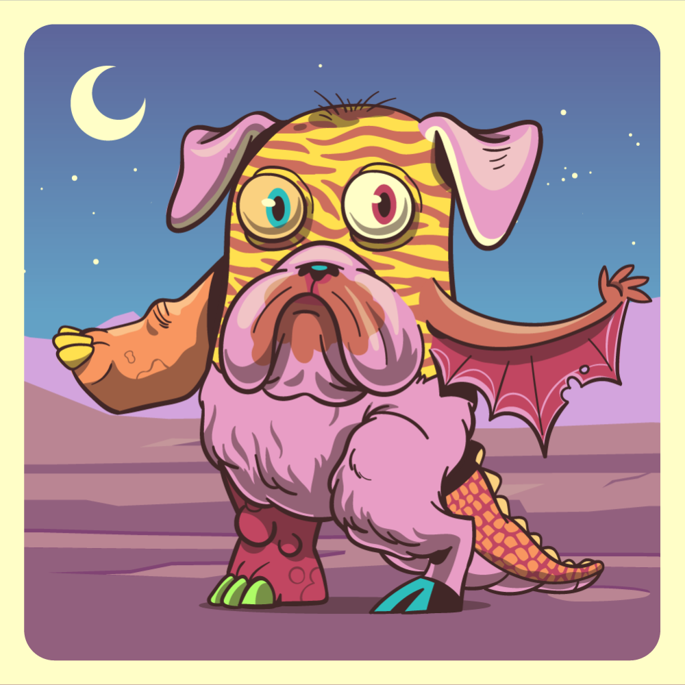 This mutant might have been a Tiger. It features blue heterochromia right eye, pink bulldog snout, pink dog ears, red bat wing, orange rhino arm, pink mad goat leg, red rhino leg and a pink crocodile tail.