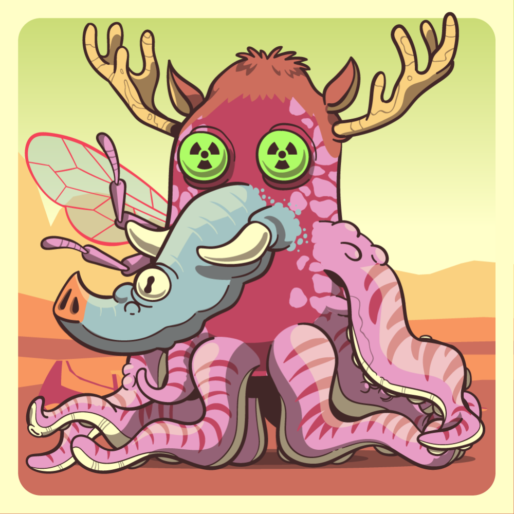 This mutant might have been a Jiraffe. It features fluo redioactive eyes, blue elephant trunk, orange moose antlers, pink octopus tentacle, pink bee wing for arms and pink octopus tentacles for legs. Mutants with Octopi legs are very long-lived, for that, they are considered bring good fortune.