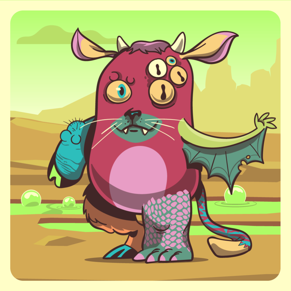 This mutant might have been a Dolphin. It features orange one+four eyes, green cat snout, pink cow ears, green bat wing, blue pig arm, pink crocodile leg, orange mad goat leg and a bluo tiger tail.