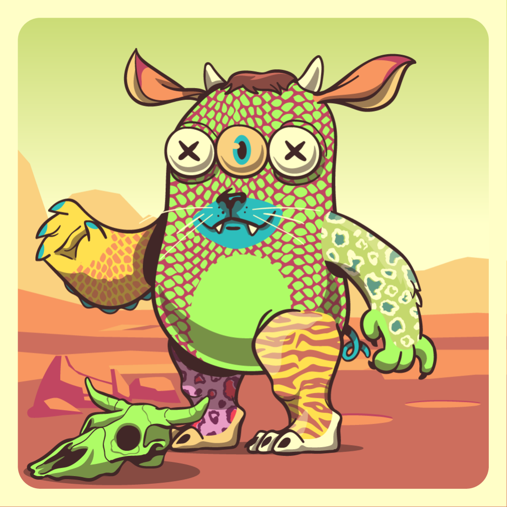 This mutant might have been a Crocodile. It features blue crossed straight-tri-eyes, blue yellowcake cow skull bearer cat snout, orange cow ears, green leopard arm, uranium crocodile arm, uranium tiger leg, pink leopard leg and a blue pig tail.