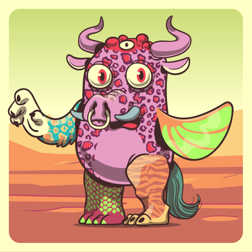 This mutant might have been a Leopard. It features red eyes, pink boar snout, pink bull horns, fluo fin fish, blue leopard arm, orange tiger leg, fluo crocodile leg and a green horse tail.