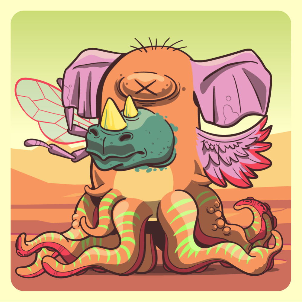 This mutant might have been a Dolphin. It features orange mole eye, green rhino horns, pink elephant ears, pink chicken wing, pink bee wing for arms and orange octopus tentacles for legs. Mutants with Octopi legs are very long-lived, for that, they are considered bring good fortune.
