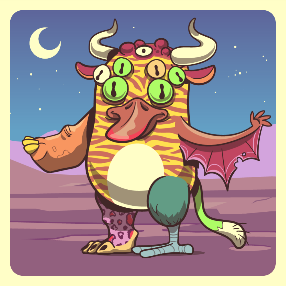 This mutant might have been a Tiger. It features fluo spider eyes, red duck beak, red bull horns, red bat wing, orange rhino arm, green chicken leg, pink leopard leg and a fluo ape tail.