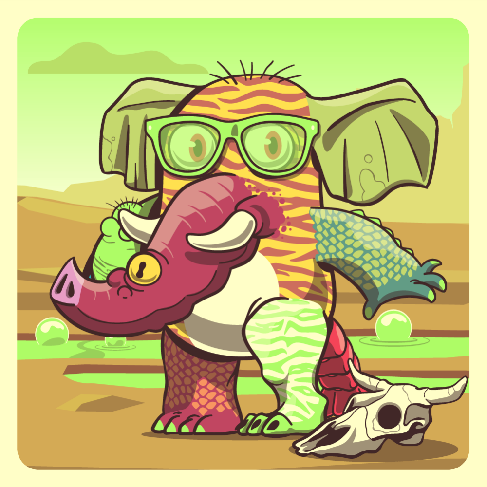 This mutant might have been a Tiger. It features green sunglases, red skull bearing elephant trunk, green elephant ears, dark-green crocodile arm, fluo pig arm, fluo tiger leg, red crocodile leg and a red lobster tail.
