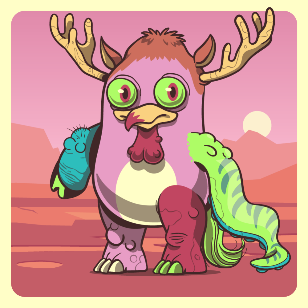 This mutant might have been a Dolphin. It features fluo eyes, red chicken beak, orange moose antlers, fluo octopus tentacle, blue pig arm, red rhino leg, pink rhino leg and a fluo horse tail.