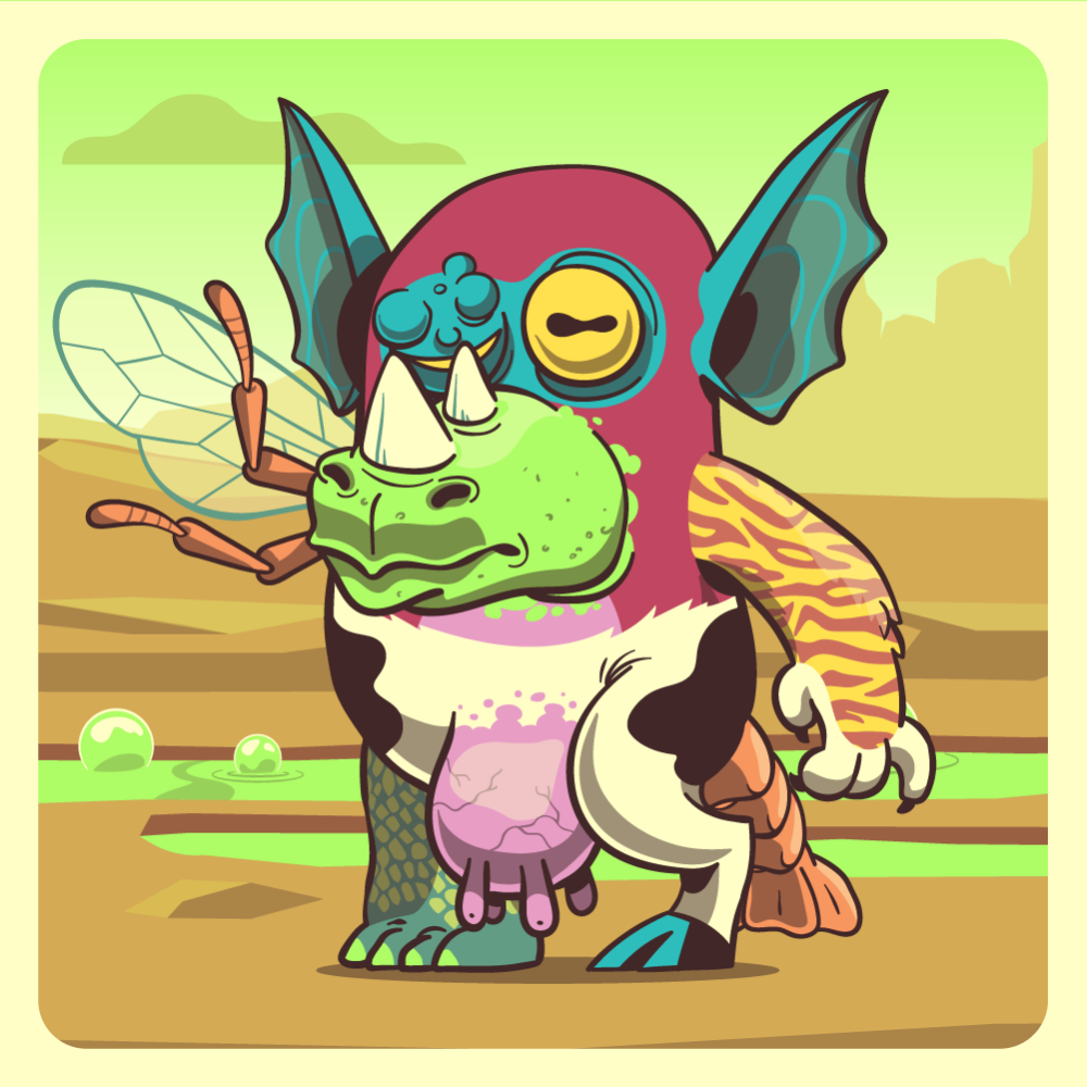 This mutant might have been a Dolphin. It features blue lazy eye, fluo rhino horns, green bat ears, uranium tiger arm, orange bee wing, white cow leg, green crocodile leg and a orange lobster tail.