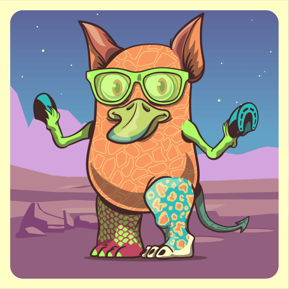 This mutant might have been a Elephant. It features green sunglases, green duck beak, orange fox ears, fluo horse front leg, fluo horse front leg, blue leopard leg, fluo crocodile leg and a green bat tail.