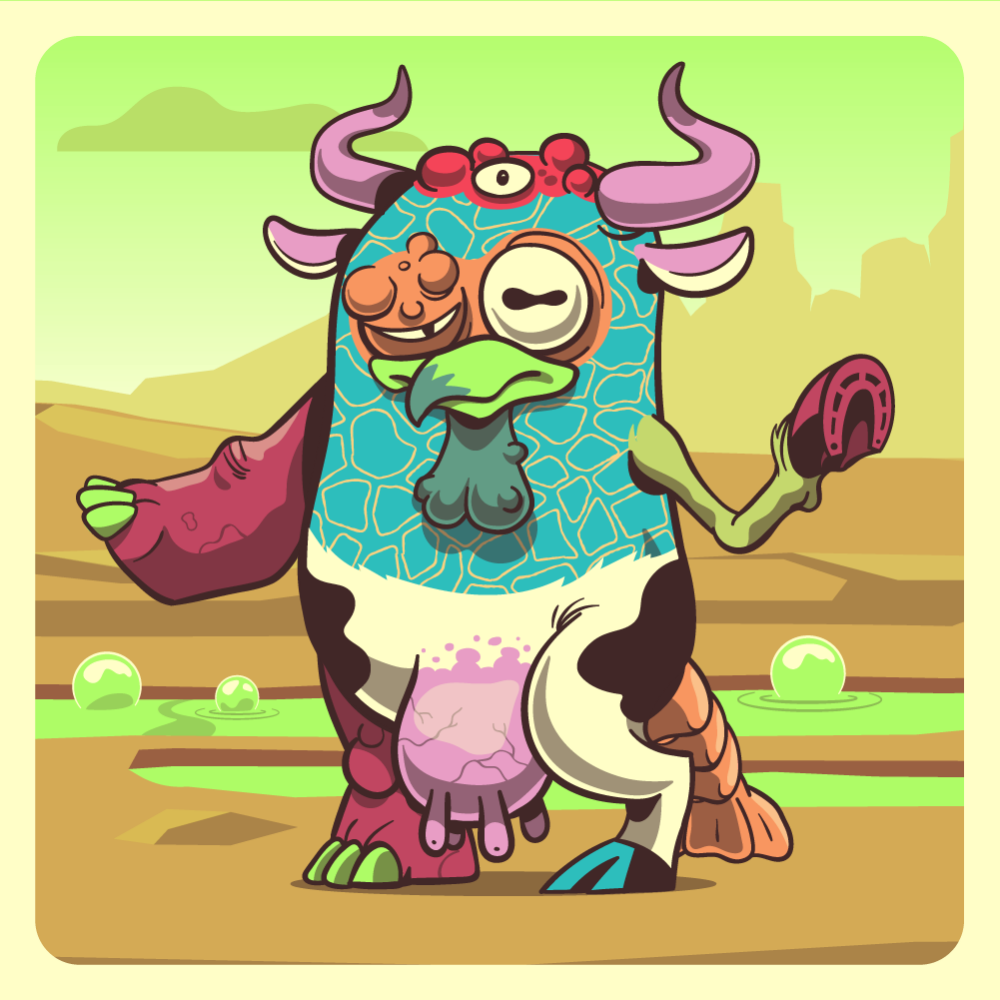 This mutant might have been a Elephant. It features orange lazy eye, fluo chicken beak, pink bull horns, green horse front leg, red rhino arm, white cow leg, red rhino leg and a orange lobster tail.