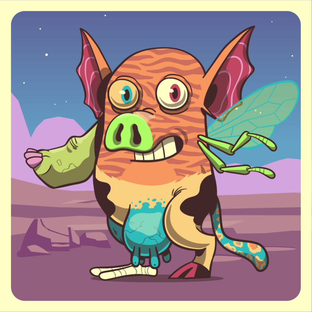 This mutant might have been a Tiger. It features blue heterochromia right eye, fluo pig snout, red bat ears, fluo bee wing, green rhino arm, uranium cow leg, blue chicken leg and a bluo leopard tail.