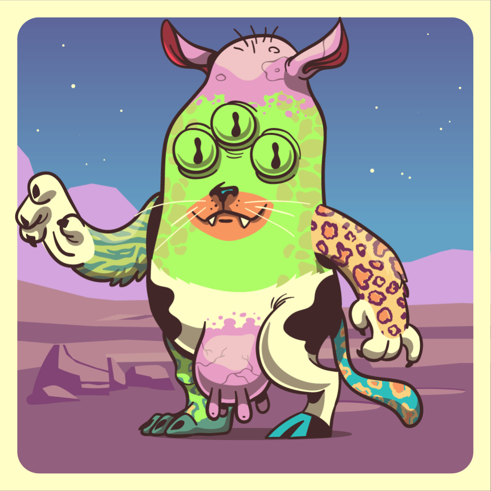 This mutant might have been a Jiraffe. It features fluo triplet eyes, orange cat snout, pink rhino ears, orange leopard arm, green tiger arm, white cow leg, fluo leopard leg and a bluo leopard tail.