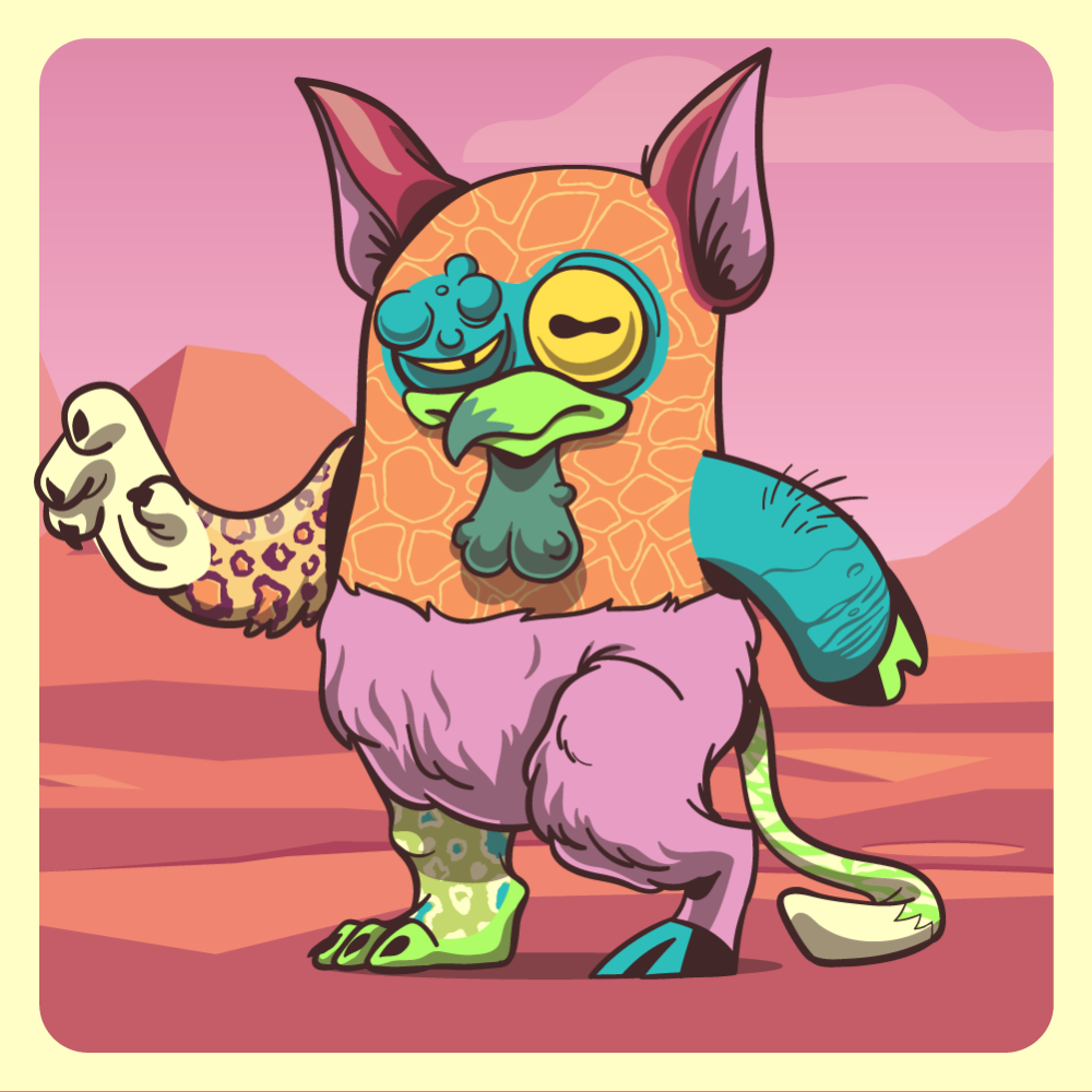 This mutant might have been a Elephant. It features blue lazy eye, fluo chicken beak, pink fox ears, blue pig arm, orange leopard arm, pink mad goat leg, green leopard leg and a fluo tiger tail.
