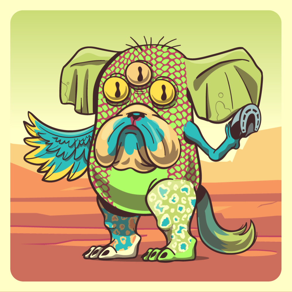 This mutant might have been a Crocodile. It features yellow triplet eyes, blue bulldog snout, green elephant ears, blue horse front leg, blue chicken wing, green leopard leg, blue leopard leg and a green fox tail.