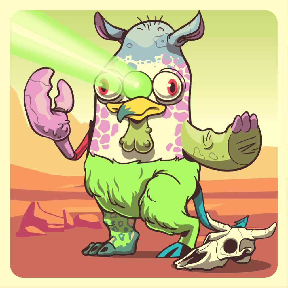 This mutant might have been a Jiraffe. It features laser straight-tri-eyes, green skull bearing chicken beak, blue rhino ears, green orange, pink lobster claw, fluo mad goat leg, fluo leopard leg and a blue bat tail.